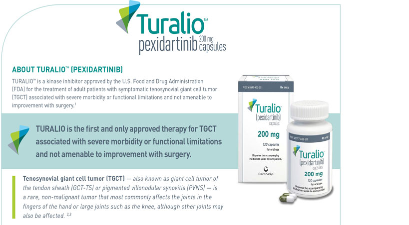 سازمان غذا و داروی آمریکا درمان خوراکی جدیدی را با نام pexidartinib (نام تجاری: Turalio، محصول Daiichi Sankyo) برای درمان Tenosynovial Giant Cell Tumor، یک رشد نادر و غیربدخیم که میتواند به طور موضعی تهاجمی شده و ناتوانکننده باشد، تائید کرد.